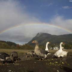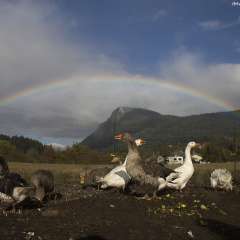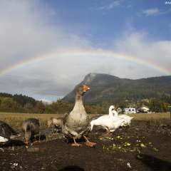 On my way down the Fulford Valley, on Salt Spring Island, British Columbia, my home base, i stopped at my friends farm and then a rainbow appeared right over mount maxwell. The geese were pretty excited to see it and so were we!